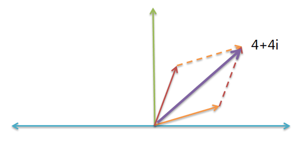 根据”平行四边形法则”,你马上得到,合成力就是 ( 3 + i ) + ( 1 + 3i ) = ( 4 + 4i )。