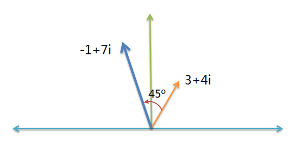 45度的航向就是 1 + i 。计算新航向,只要把这两个航向 3 + 4i 与 1 + i 相乘就可以了(原因在下一节解释):