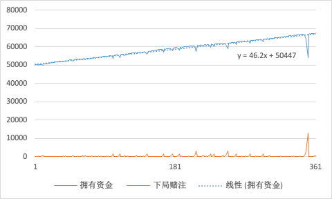 咳咳,所以说,实验结论就是,在统计数据明显不够充足的情况下(=_=),97% 的玩家在 50 天左右就输光,但与此同时,想依靠此路挣个上千万也不是没有可能的。