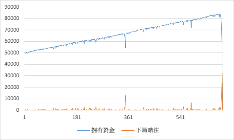 可以看到,从第 676 次时,发哥连续遇到了 10 次「小」, 好不容易积攒起来的 8 万财富毁于一旦。